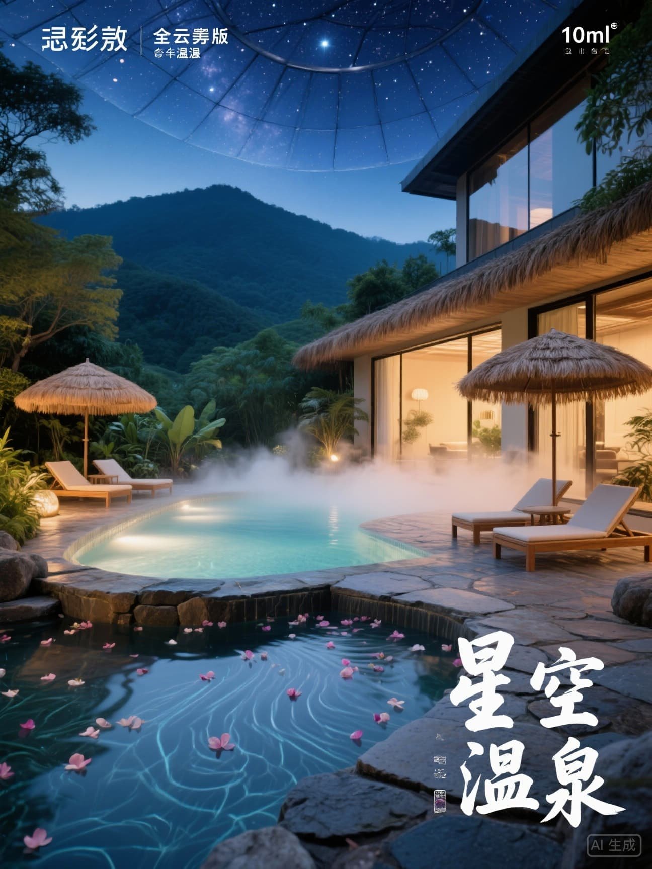 • 温泉技术系统:天然花岗岩温泉池(厚度10cm,保温层5cm),地源热泵加热(COP值4.5,能耗0.2kWh/m³) • 星空体验优化:可开合屋顶(电动平移,开启面积50%),防水星空帘(透光率30%,防紫外线UPF50+) • 养生功能配置:穴位按摩喷嘴(12个,水压0.3-0.5MPa可调),香薰系统(支持薰衣草、茶树等6种精油